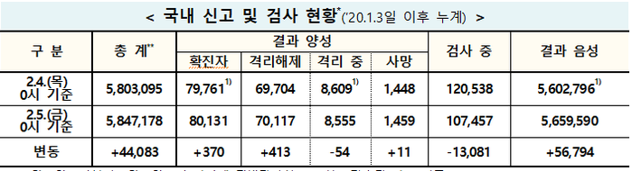 ▲ 5일 0시 기준 코로나19 국내 신고 및 검사 현황. [출처= 중앙방역대책본부] |