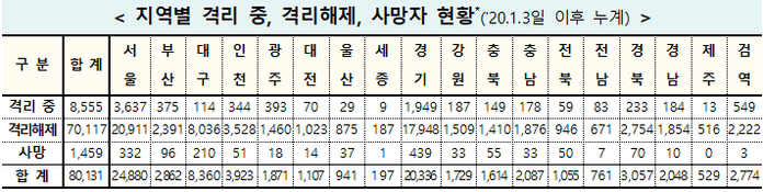 전날 하루 413명이 추가 완치돼 누적 격리해제자는 7만117명으로 줄었다. 현재 격리 중인 환자는 전날 대비 54명 적은 8555명이다.