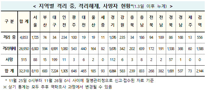 ▲ 26일 0시 기준 코로나19 격리해제 및 사망자 현황. [출처= 중앙방역대책본부] |
