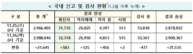 ▲ 26일 0시 기준 코로나19 국내신고 및 검사 현황. [출처= 중앙방역대책본부] |