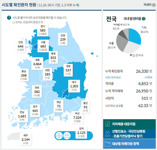 ▲ 26일 0시 기준 코로나19 시도별 확진환자 현황. [출처= 중앙방역대책본부] |