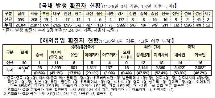 국내발생 환자는 수도권에서 72.7%인 402명이 발생했고, 비수도권에서 151명이 나왔다.