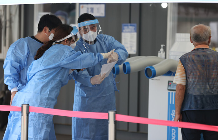▲ 13일 오전 서울역 광장에 설치된 서울 중구 임시선별검사소에서 관계자들이 분주히 움직이고 있다. [사진=연합뉴스] |