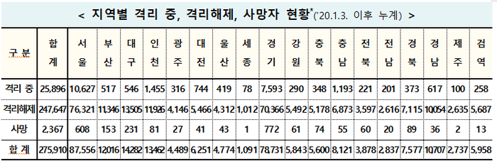 전날 하루 2142명이 추가 완치돼 누적 격리해제자는 24만7647명으로 완치율은 89.76%를 보였다. 격리치료 중인 환자는 총 2만5896명으로 전날보다 652명이 줄었다.
