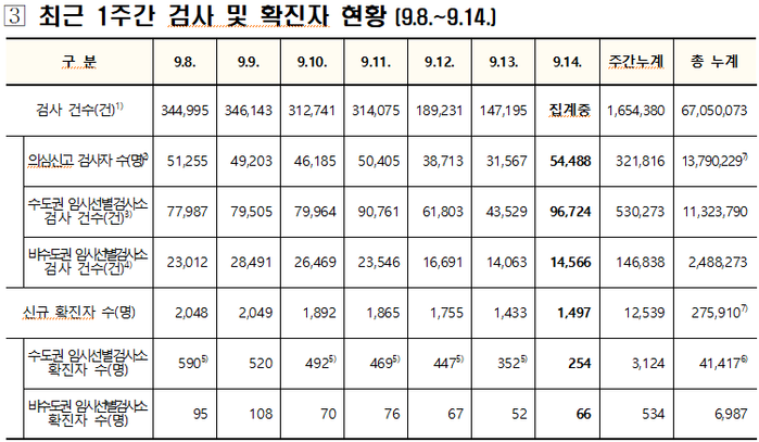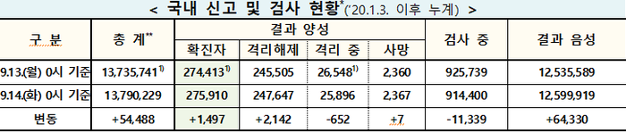 중앙방역대책본부는 14일 0시 기준으로 코로나19 신규 확진자가 1497명 발생해 누적 27만5910명(해외유입 1만4003명)으로 집계됐다고 밝혔다.