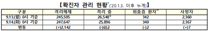 ▲ 14일 0시 기준 코로나19 확진자 관리 현황. [출처=중앙방역대책본부] |