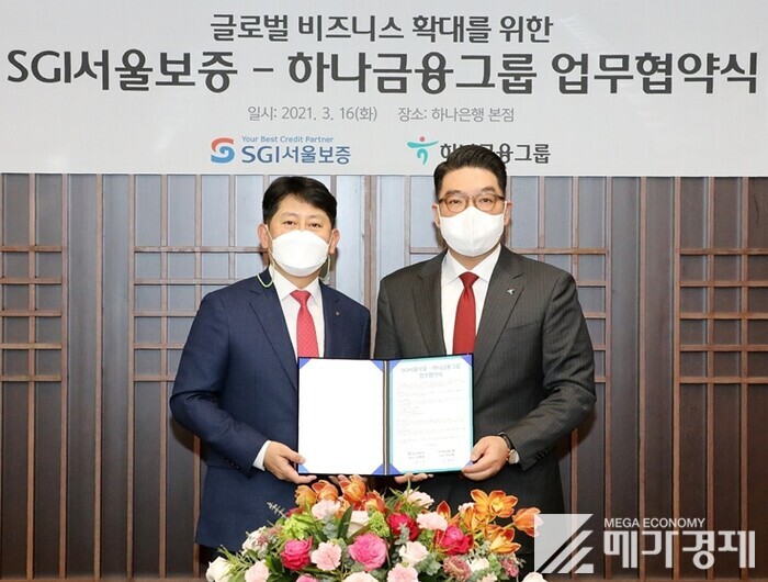 [메가경제=황동현 기자] 하나금융그룹(회장 김정태)은 SGI서울보증(대표이사 유광열)과 지난 16일 하나은행 본점에서 '글로벌 비즈니스 확대를 위한 업무협약'을 체결했다고 밝혔다.