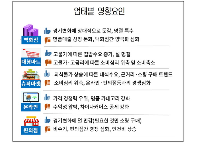 업태별로는 모든 업태에 걸쳐 전망치가 하락한 가운데, 백화점·대형마트·슈퍼마켓의 하락폭이 컸고 불황에 강했던 온라인쇼핑, 편의점 업계 전망치도 소폭 하락했다.