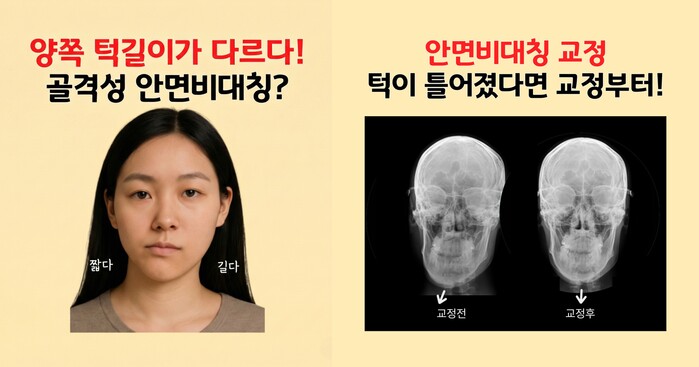 [메가경제=양대선 기자] 사진이나 엑스레이(X-ray)를 찍었을 때 양쪽 턱 길이나 모양이 다르게 보이면 뼈 자체가 다르다고 판단하기 쉽다. 한쪽 턱은 길고 다른 쪽은 짧거나, 한쪽은 넓고 다른 쪽은 좁으면 양쪽 뼈의 크기나 형태 자체가 다르다고 생각하는 것이다.