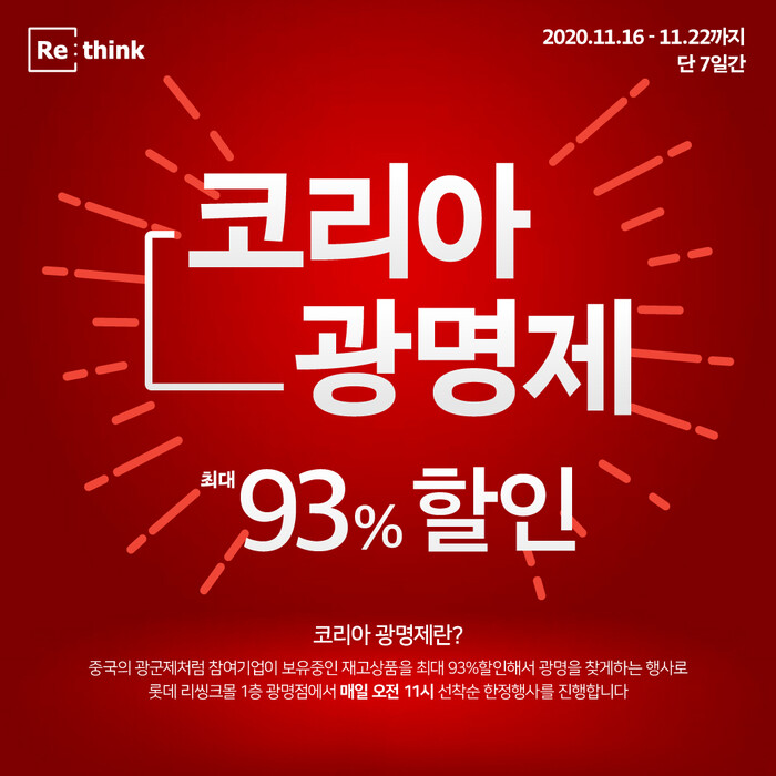 리씽크는 중국 최대 쇼핑 축제인 광군제처럼 리씽크만의 일주일간 쇼핑 축제인 ‘코리아 광명제’를 기획했다. 롯데몰 광명점 리씽크 매장에서 진행된다는 의미로 광명점의 ‘광명’과, 참여기업들이 할인 행사를 통해 재고를 소진하고 ‘광명’을 찾는다는 뜻을 담았다.