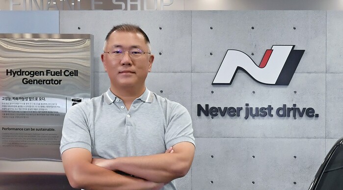 | ▲ N 브랜드 엠블럼 옆의 정의선 회장[사진=현대자동차 제공] |