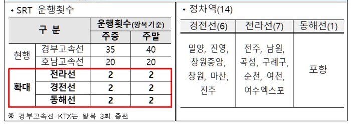 신규 운행하는 경전선(창원‧진주), 전라선(순천‧여수), 동해선(포항)은 각 일 왕복 2회 운행하며, 경부선은 공급에 여유가 있는 월~목에 한해 일 왕복 40회에서 왕복 35회로 조정되고 주말 운행은 일 왕복 40회를 유지한다.