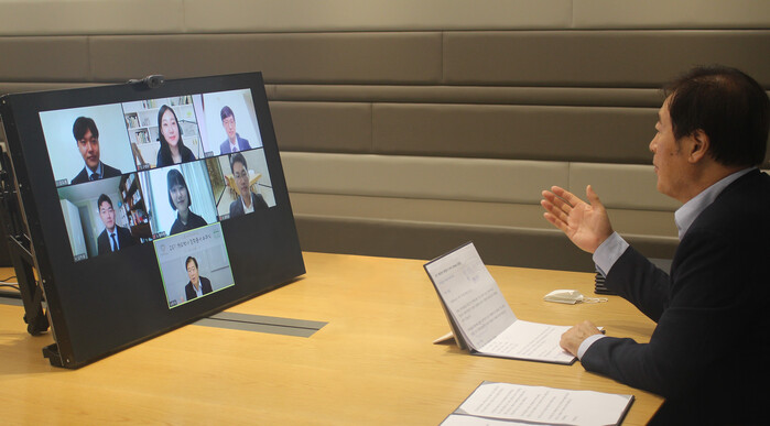 | ▲ 지난 12일 서울 종로구 흥국생명빌딩에서 열린 '제29기 해외박사 장학증서 수여식' 행사에서 허승조 일주학술문화재단 이사장(오른쪽)이 온라인 화상플랫폼 '줌(Zoom)'을 통해 장학생들을 격려하고 있다. [사진=일주학술문화재단 제공] |