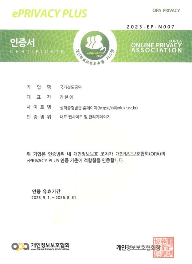 개인정보보호 인증(ePRIVACY PLUS)은 인터넷 웹사이트를 안전하게 이용할 수 있도록 개인정보보호협회(OPA)가 개인정보보호 정책 및 관리수준을 종합적이고 객관적으로 평가해 인증을 부여하는 제도이며, 철도공단은 지속적인 개인정보 안전성 확보 노력으로 총 110여 개의 항목을 통과해 인증을 획득했다.