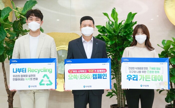 우리은행(은행장 권광석)은 ESG경영 강화를 위해 전사적으로 추진 중인‘으쓱(ESG) 캠페인’의 일환으로 본점 전부서에 분리수거함을 도입하는‘나부터 Recycling’캠페인과 매주 금요일 직원식당에 저탄소 식단을 제공하는‘우리 가든 데이’를 실시한다고 1일 밝혔다.