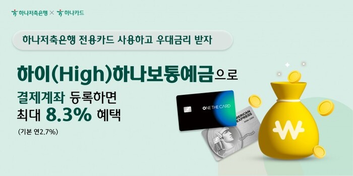 이벤트는 하나저축은행 전용카드인 하나카드 '원더카드 프리 플러스 카드' 또는 '하나 스카이패스 아멕스 플래티늄 카드'의 결제계좌를 '하이(High)하나 보통예금'에 연결하고 자동납부 하면 카드대금 결제 익월 한 달간 '하이(High)하나 보통예금'에 우대금리를 제공한다.