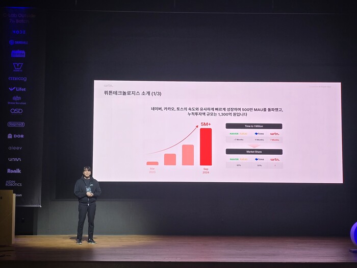 먼저, C랩 아웃사이드 4기 졸업사인 '뤼튼테크놀로지스'는 생성형 AI 플랫폼 스타트업 최초로 누적투자 1300억원을 유치했고, AI 전환(AI Transformation, AX) 사업에 진출해 노동시간 단축과 생산성 증가 등의 성과를 거뒀다고 설명했다. 또 과기정통부가 주관하는 '글로 벌 정보통신기술 미래 유니콘 유망 기업'으로 선정되는 등 설립 4년 만에 국내 대표 AI 기업으로 성장해 유니콘 기업의 반열에 한 걸음 다가서고 있다.