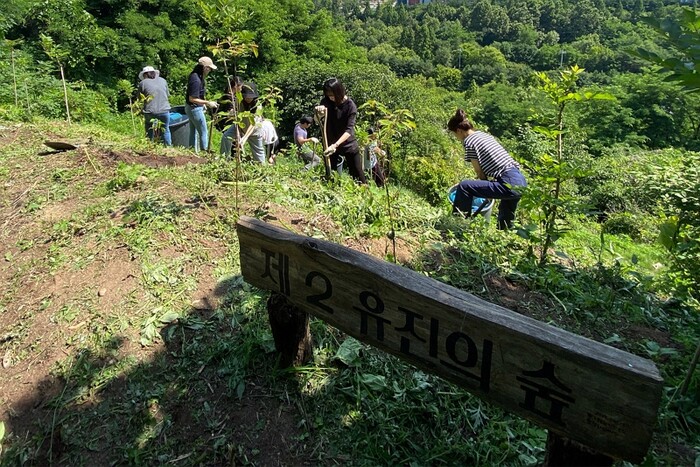 ▲유진투자증권 임직원들이 ‘1억보 걷고 기부하기’ 챌린지에 성공해 노을공원에서 기부한 500그루의 나무를 기부했다. 지난 17일 기부한 나무를 임직원들이 직접 심고있다. [사진=유진투자증권] |