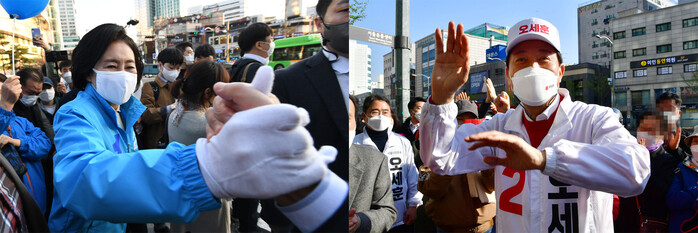 ▲ 서울시장 보궐선거를 이틀 앞둔 5일 더불어민주당 박영선 서울시장 후보와 국민의힘 오세훈 서울시장 후보가 각각 관악구 신림역 사거리와 강서구 등촌역 인근에서 시민들과 인사하고 있다. [국회사진기자단=연합뉴스] |