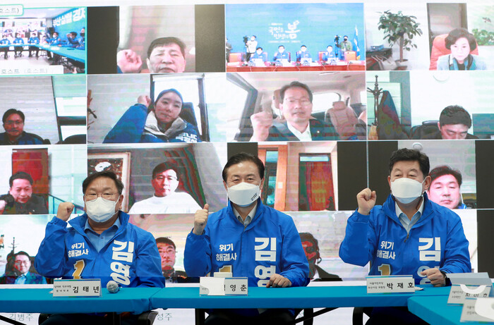 ▲ 더불어민주당 김영춘 부산시장 후보와 김태년 당 대표 직무대행 등이 6일 오전 부산진구 선거사무소에서 열린 화상 의원총회에서 파이팅하고 있다. [부산= 연합뉴스] |