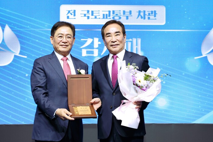 ▲여형구 국토교통부 前차관(사진右)이 감사패를 수여받고 이대성 항공안전기술원장과 기념쵤영을 하고 있다. |