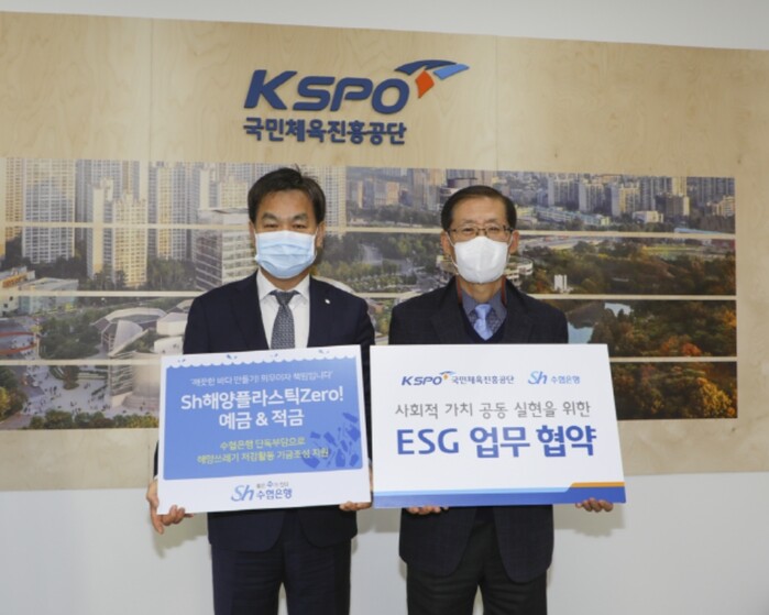 Sh수협은행이 국민체육진흥공단과 손잡고 ESG 실천확산을 위한 사회공헌활동 추진에 나선다. 양샤는 협약을 체결해 본격적인 사회공헌활동에 나서고 국민체육진흥공단 조현재 이사장은 해양플라스틱 쓰레기 저감활동을 지원하는 수협은행 공익상품에 릴레이 가입했다.