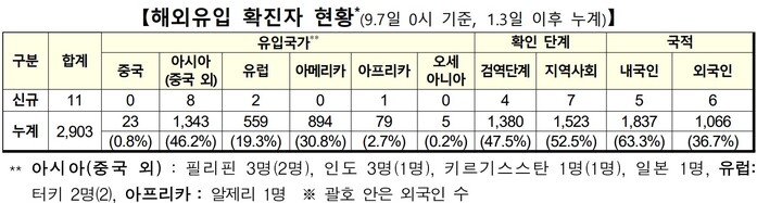 이날 해외유입 확진자는 11명으로, 이 가운데 4명은 공항이나 항만 입국 검역 과정에서 확인됐다. 나머지 7명은 지역 거주지나 임시생활시설에서 자가격리하던 중 양성 판정을 받았다.