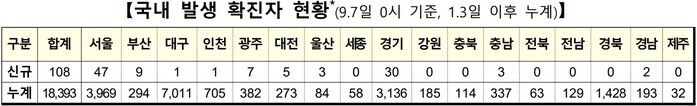 국내발생 확진자 108명을 지역별로 보면, 서울 47명, 경기 30명, 인천 1명 등 수도권에서 78명이 발생했다.