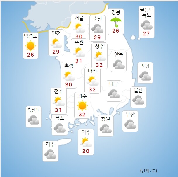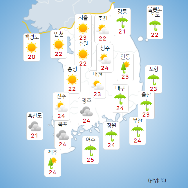 기상청에 따르면, 오늘 날씨는 전국이 대체로 흐리고, 오전까지 경기남부와 강원도, 충남북부, 전남권, 경상권에 빗방울이 떨어지는 곳이 있겠다. 제주도에는 비가 내리고 오후부터 강원영동, 밤부터 경상권해안 중심으로 비가 시작되겠다.