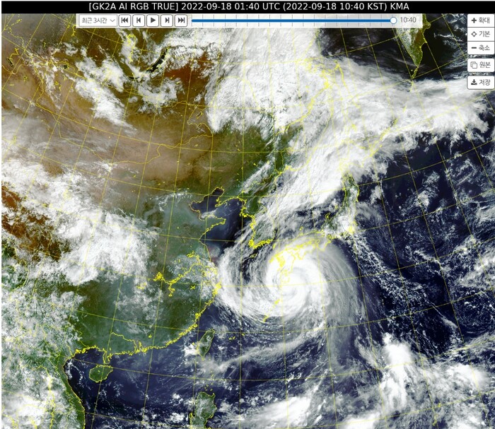 ▲ 천리안위성 2A호가 촬영한 18일 오전 10시40분 현재 한반도 주변 영상. 제14호 태풍 '난마돌'의 거친 위력이 잘 보인다. [출처=가상청 날씨누리] |