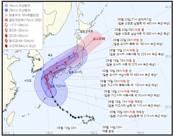 이후 방향을 틀어 규슈 지역 후쿠오카현을 지나 야마구치현-히로시마현-돗토리현 등지를 지나 동해 먼바다쪽을 스치고 다시 일본 동북부 지역으로 상륙한 뒤 20일 심야에 태평양쪽으로 빠져나갈 것으로 예상됐다.