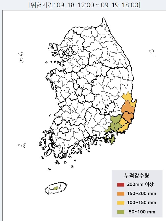 내일(19일)까지 예상 강수량은 경상권 해안, 강원영동, 울릉도·독도에 50~100mm(많은 곳 경상권 해안은 150mm 이상), 경상권 동부 내륙, 제주도 산지에 20~80mm, 전라 동부, 경상서부 내륙, 제주도(산지 제외)에 5~40mm이다.