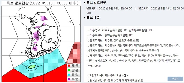 오전 8시를 기해 제주도 남쪽 바깥 먼바다, 남해 동부 바깥 먼바다에 태풍경보, 동해 남부 남쪽 바깥 먼바다에 태풍주의보, 제주도와 전라남도 거문도와 초도에 강풍주의보가 발효됐다.