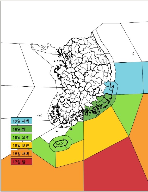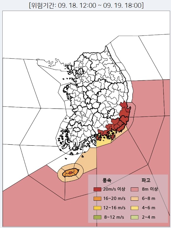우리나라는 태풍 중심의 좌측의 반원에 해당하는 ‘가항반원’의 강풍반경 끝자락에 제주 동부와 경상권 해안, 부산, 울산을 비롯, 거제, 창원, 김해, 양산, 경주, 포항 등 경상도 남부와 남동지역이 들어갈 것으로 예상된다.