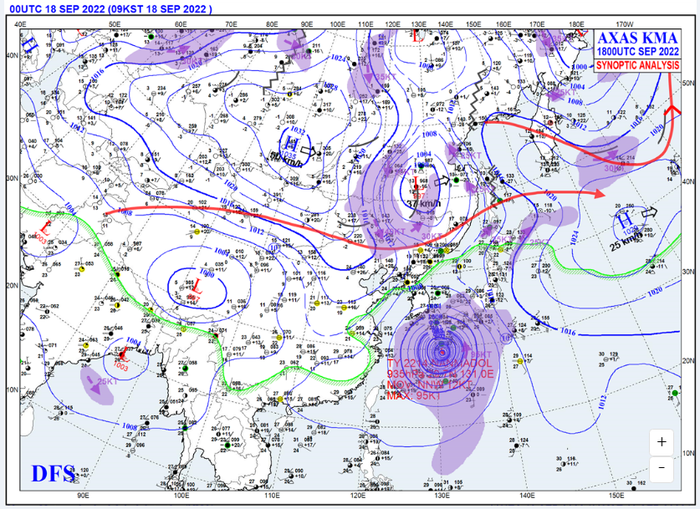 ▲ 18일 오전 9시 기준 한반도 주변의 분석일기도. [출처=기상청 날씨누리] |