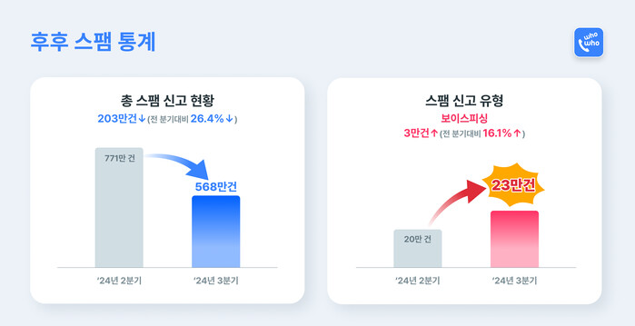 [메가경제=신승민 기자] 스팸 차단 애플리케이션 '후후'를 서비스하는 브이피는 올해 들어 계속 증가하던 후후 앱 이용자들의 스팸신고 건수가 3분기에 급격히 감소했다고 14일 밝혔다. 지난 2분기 771만건이었던 스팸신고는 3분기 들어 26.4% 급감, 568만건에 머무르며 올해 분기 중 가장 적은 건수를 기록했다.