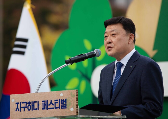 ▲지난 24일 오후 서울 광화문광장에서 열린 ‘지구하다 페스티벌’ 개막식에서 편정범 교보생명 대표이사 사장이 축사를 하고 있다. [사진=교보생명] |