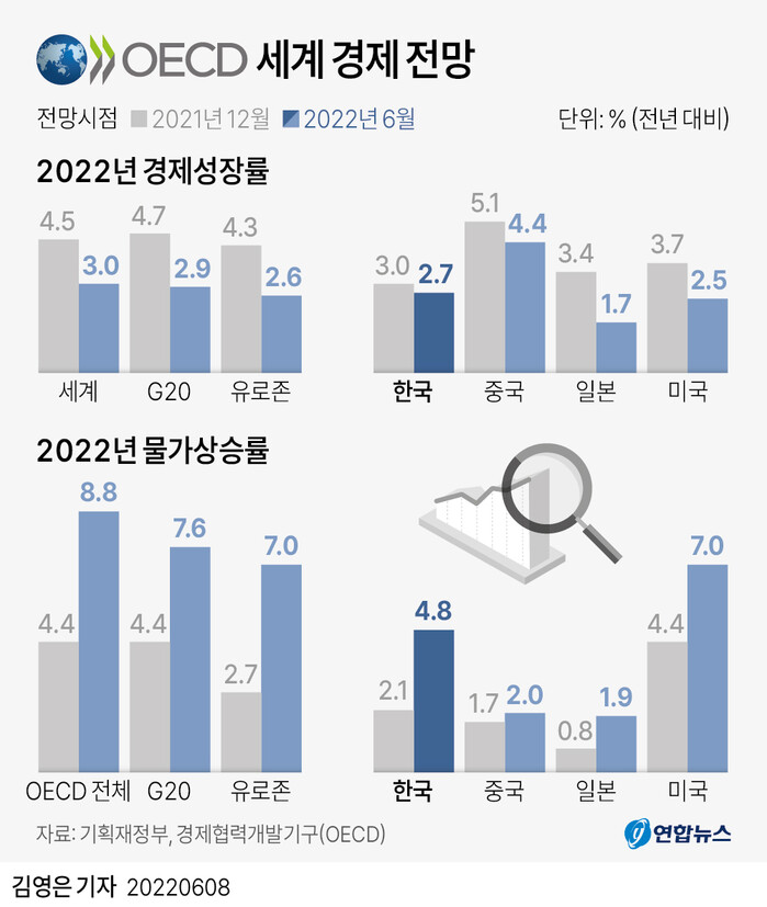 OECD는 세계 평균 물가상승률 전망치도 올해 8.8%, 내년 6.1%로 상향 조정했다. 이는 지난해 12월 전망 대비 각각 4.4%포인트, 3.0%포인트 올려 잡은 것이다.