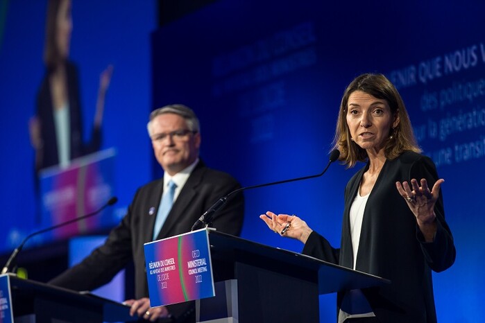 | ▲ 경제협력개발기구(OECD) 사무총장 마티아스 코만(왼쪽)과 OECD 수석경제학자 로렌스 분이 8일(현지시간) 프랑스 파리에서 열린 OECD 각료회의 전 OECD 경제전망 발표 기자회견에 참석하고 있다. 2022년 OECD 각료회의는 9일부터 10일까지 열린다. [EPA=연합뉴스] |