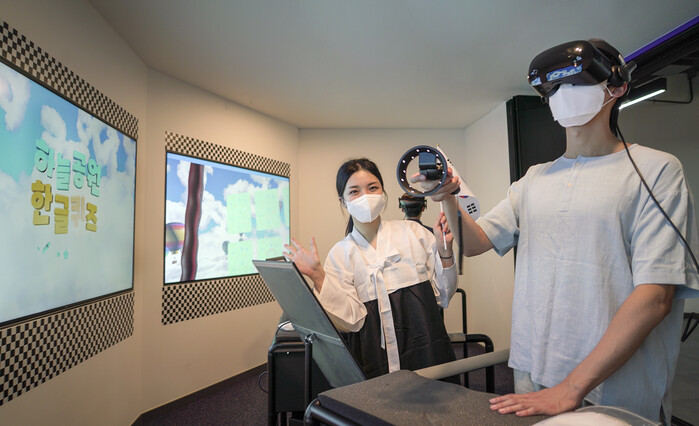 | ▲ 관람객이 VR기술을 활용한 ‘하늘공원 한글 퀴즈’를 체험 중인 모습 [사진=SK텔레콤 제공] |