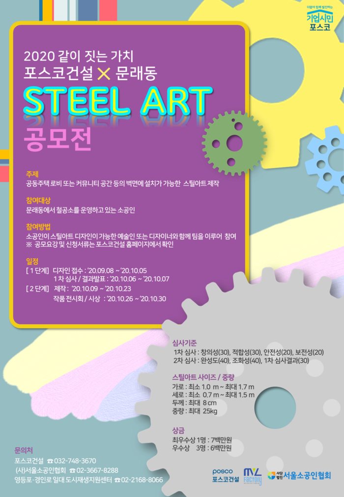 [메가경제= 임준혁 기자] 포스코건설이 서울 문래동에서 철공소를 운영하는 소공인들을 대상으로 철제조형물 디자인을 공모한다고 14일 밝혔다.