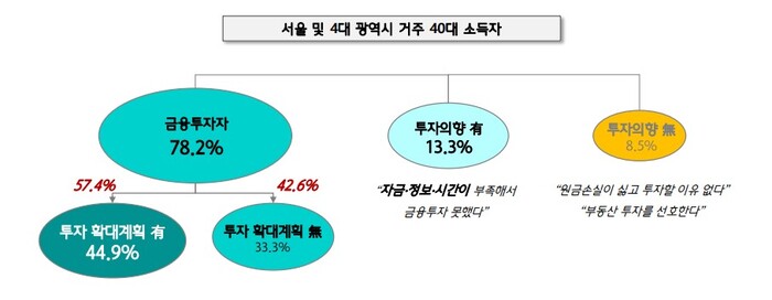 더불어 40대 초반은 ‘주택(부동산) 등의 가격 상승’, 40대 후반은 ‘향후 가구소득이 그리 늘지 않을 것’을 투자 확대 이유로 들었다.