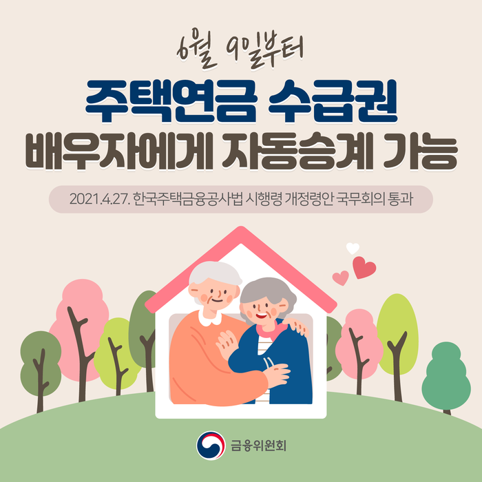 2021년 6월 9일부터 연금수급권이 배우자에게 자동승계되는 주택연금 및 연금수급액의 압류를 방지하는 전용통장이 도입되는 내용이 골자다.