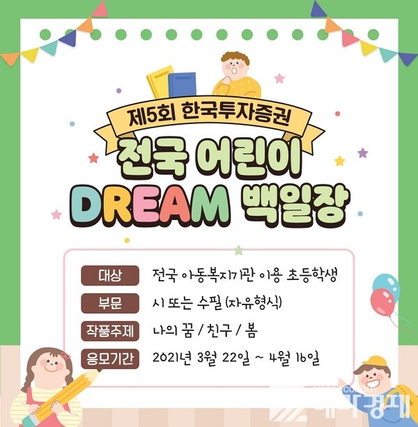 [메가경제=황동현 기자] 한국금융지주 자회사 한국투자증권(사장 정일문)은 초록우산 어린이재단과 함께 ‘제5회 한국투자증권 전국 어린이 Dream 백일장’을 개최한다고 23일 밝혔다.