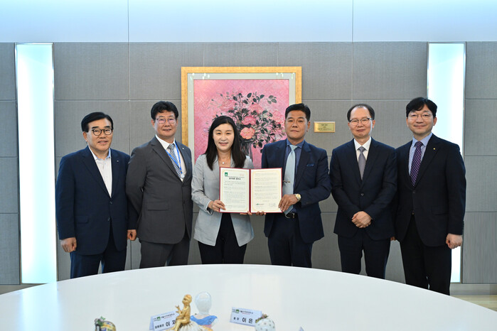 ▲ 이은주 서울사이버대학교 총장(좌측에서 세 번째)과 김영철 이가부동산중개 대표(좌측에서 네 번째)를 비롯한 양측 관계자들이 업무협약 후 기념사진을 찍고 있다. [사진=서울사이버대학교] |