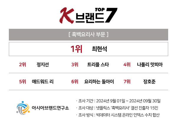 ‘K-브랜드 톱7’ 흑백요리사 부문은 최현석이 1위의 영예를 차지한 가운데, 2위 정지선, 3위 트리플 스타, 4위 나폴리 맛피아, 5위 애드워드 리, 6위 요리하는 돌아이, 7위 장호준 등이 이름을 올렸다.