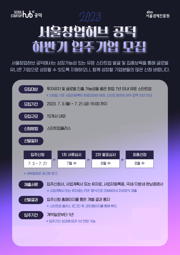 최종 선정된 기업은 서울창업허브 공덕에 1년간 입주할 수 있다. 추후 연장평가를 통해 1회에 한해 1년 연장, 최대 2년간 입주할 수 있다.