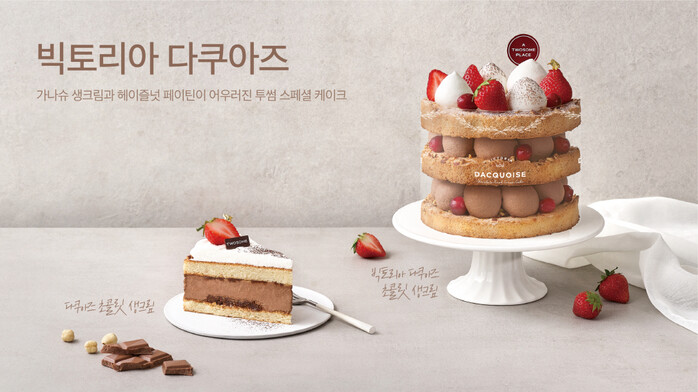 한편, 투썸플레이스는 이번 여름 폭신하고 촉촉한 프리미엄 다쿠아즈 시트가 매력적인 ‘빅토리아 다쿠아즈 초콜릿 생크림’ 케이크를 조각 케이크로 확대 출시한다. 시트와 가나슈 생크림이 겹겹이 쌓인 기존의 홈메이드 스타일 디자인은 물론 고급스러운 가나슈 생크림과 초코칩 헤이즐넛 페이틴이 어우러져 진한 초콜릿 풍미와 부드러운 식감을 즐길 수 있다. 과일 토핑에 따라 딸기와 베리의 2종류로 출시된다.