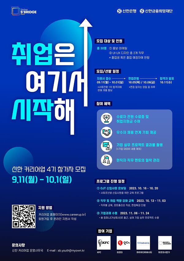 [메가경제=오민아 기자] 신한은행(은행장 정상혁)은 청년 구직자의 취업 준비를 돕고 실무 역량을 높이는 인재 양성 프로그램 ‘신한 커리어업(Career Up)’ 4기를 모집한다고 12일 밝혔다.