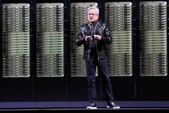 | ▲젠슨 황 엔비디아 CEO가 지난 5일(현지시간) 미국 네바다주 라스베이거스 퐁텐블로 호텔에서 열린 엔비디아 CES 2026 라이브에서 기조연설하고 있다. [사진=연합뉴스] |